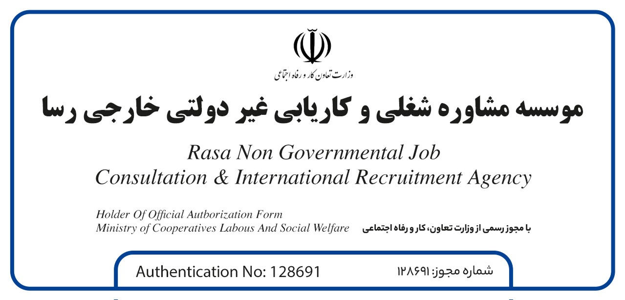 مؤسسه کاریابی بینالمللی «ارزش آفرینان رسا» با شماره ثبت ۴۴۰۱۲ و تحت نظارت وزارت تعاون، کار و رفاه اجتماعی، فعالیت خود را به صورت کاملاً قانونی و در چارچوب قوانین و مقررات جمهوری اسلامی ایران آغاز نموده است. این مؤسسه با بهرهگیری از مجربترین کارشناسان ایرانی و بینالمللی در حوزه کاریابی بینالمللی، خدمات ویژهای در زمینه ارائه فرصتهای شغلی خارج از کشور (جاب آفر) و مشاورههای تخصصی مرتبط ارائه میدهد.